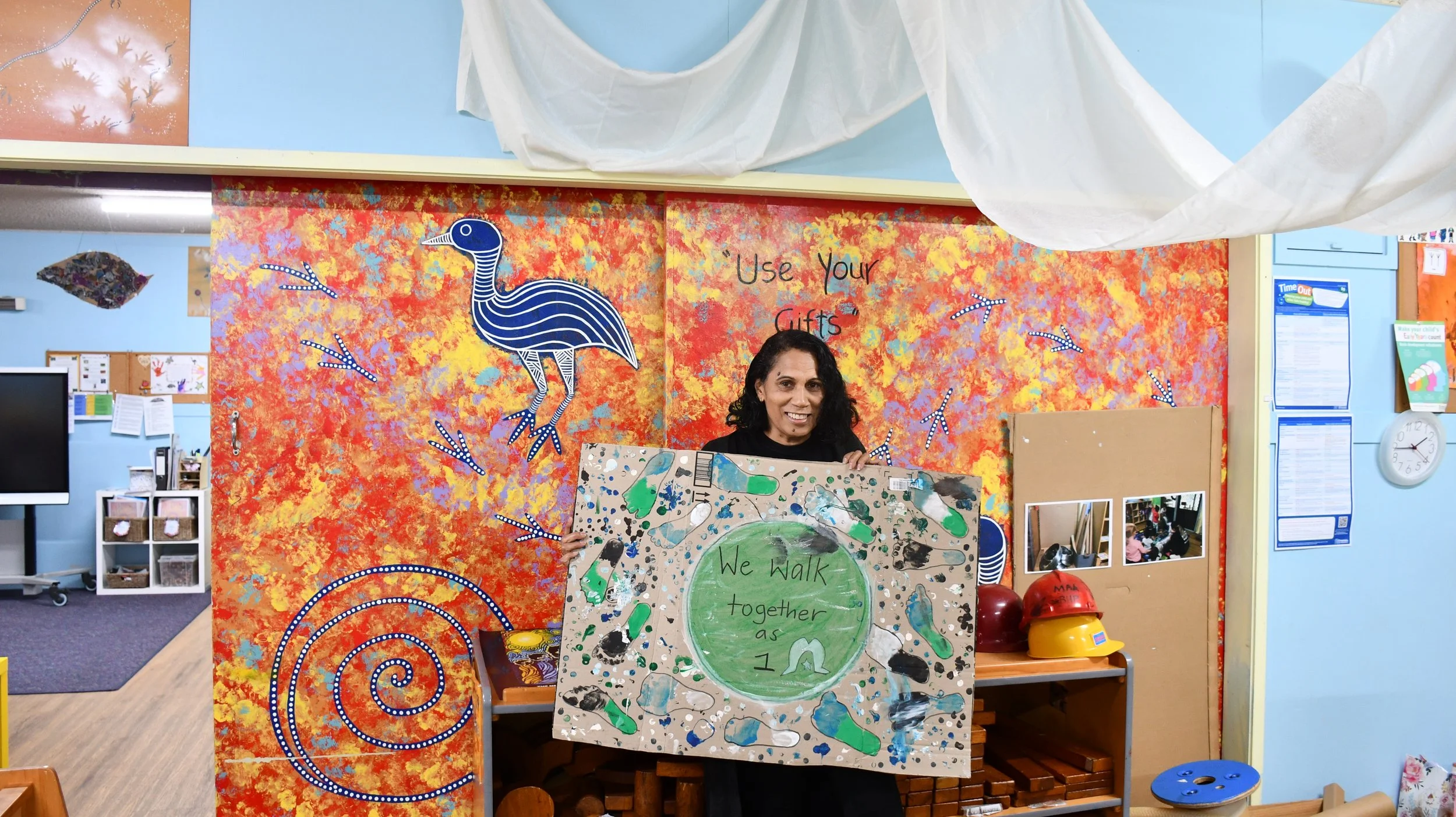 Wandarrah Preschool ECT Lisa with artwork for Reconciliation Week 2025.