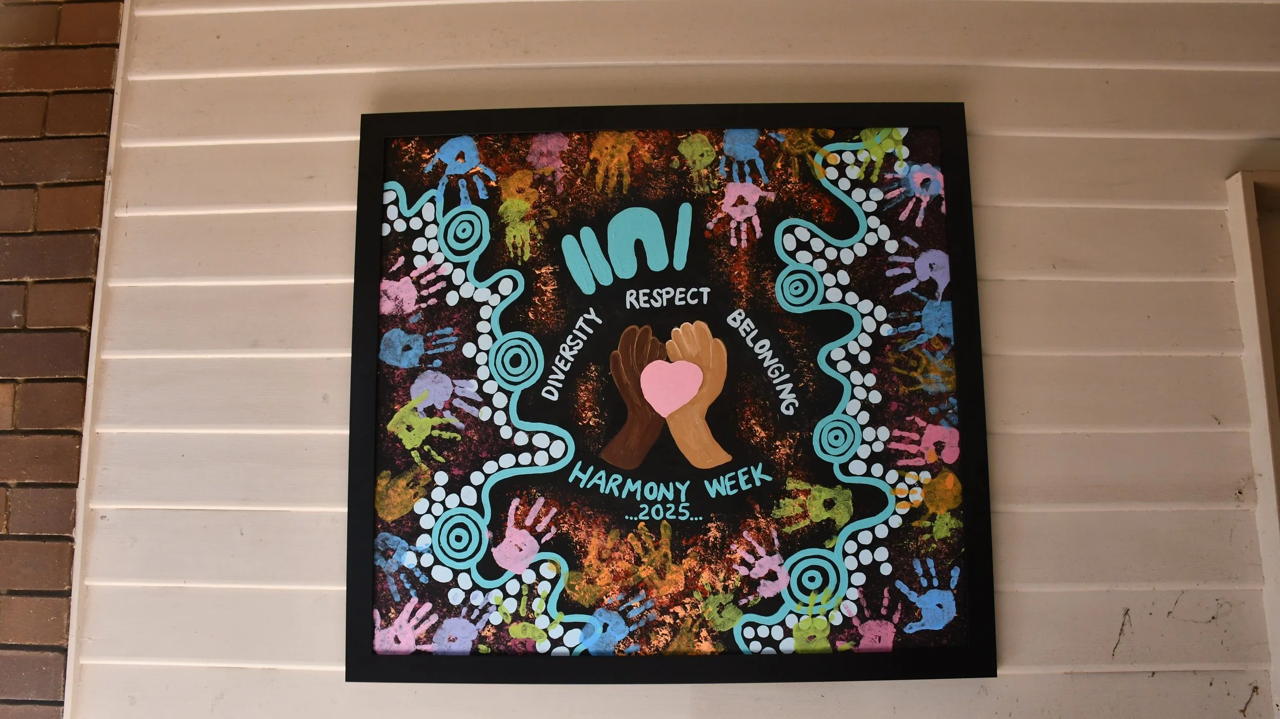 Artwork by Kylie Hill (Handprints by Wandarrah Preschool for Harmony Day).